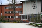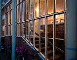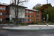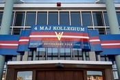 Mod John Winthers Plads fremtræder facaden symmetrisk opbygget, med fremspringende, søjlebårne altaner i enderne, og et ligeledes fremspringende, verandalignende midterparti, hvor indgangsdøren findes. Over denne er placeret et stiliseret frihedskæmper-armbind i metal, bemalet i røde, blå og hvide farver, med påskriften: "4. Maj Kollegium. Rejst af det danske folk 1950-51".