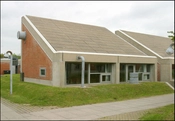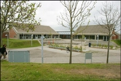 Et tilbagetrukket glasparti markerer og beskytter indgangen til den bagveliggende aula.