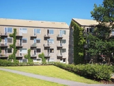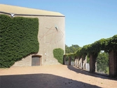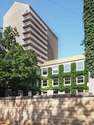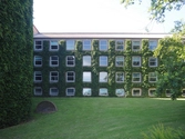 Hovedbygningens bagside mod parken. Til højre den store Aula med solur.