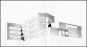 Tegningen var en del af det konkurenceforslag, der vandt førstpræmie, og viser første etappe af byggeriet.