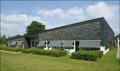 Facaderne er beklædt med sorttjærede spån i pommersk fyr som er karakteristisk for hele byggeriet. Tag og gavle er beklædt med traditionelt tagpap.