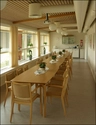 Alle gange er veloplyste af dagslys. De høje lyse træsøjler støtter loftskonstruktionen, der er beklædt med træbeton og høvlede lægter.