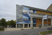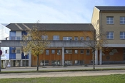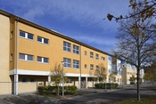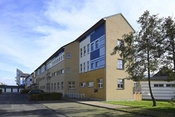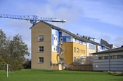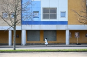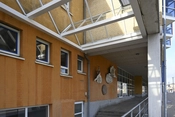 Bygningen er en betonkonstruktion med skalmur af gule mursten og de karakteristiske farvede pulverlakerede metalkassetter. Taget er konstrueret af mellemstøttede gitterspær på betonelementdæk og dækket af gule betontagsten.