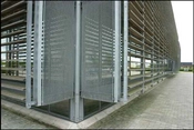Mellem lameller og glas ligger flugtveje i form af gitterristbroer og -trapper.