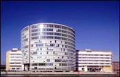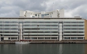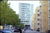 Mod vest dækker en aflang kontorstok langs Midtermolens kaj for firmadomicilets konkavt krumme hovedtårn i 12 etager.