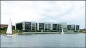 Den store skulptur foran bygningen på havnepromenaden er udført af Olafur Eliasson.
