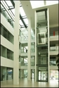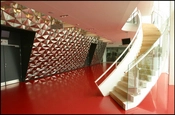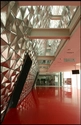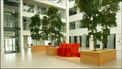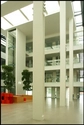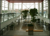 Man ankommer centralt i det store atrium, der rummer både kantine og fællesarealer. Den brede trappe har siddemuligheder som i et amfiteater.