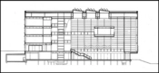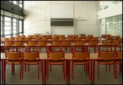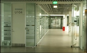 Undervisningsrum og auditorier er udført med lyddæmpende glasvægge mod de langsgående forbindelsesgange.