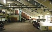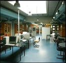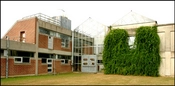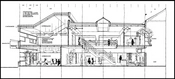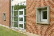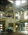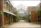Sammenkobling mellem den forsænkede idrætshal (th) og undervisningslokaler.