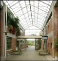 Hovedindgangen fører ind til den gennemgående, glasoverdækkede gade som forløber i hele bygningens længde.