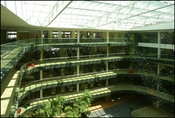 Det store atrium spænder i hele husets højde og skærer op igennem fem etager, og er et imponerende organisk formet rum på 33 x 33 meter i grundplan. Rummets ovenlys er 1000 m2 stort og bidrager med et meget varieret dagslys i atriet.