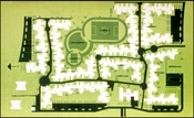 Bebyggelsen grupperer sig omkring indre gader mens grønne områder og parkeringspladser er placeret i udkanten.
