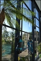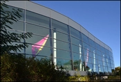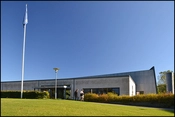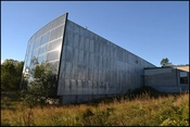Set fra syd. Facaden med det store bølgede glasparti vender sig mod naturgrund med skærmende træer.