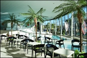 Cafeen ligger højt så man som besøgende kan følge med i hallens aktiviteter