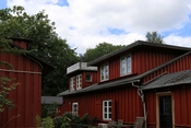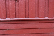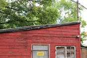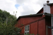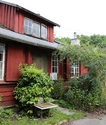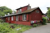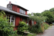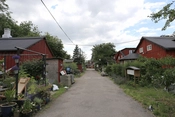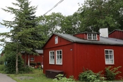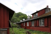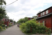 Bebyggelsens hovedgade, rødmalede træbarakker med knopskydning