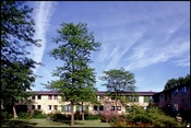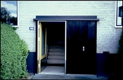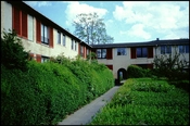 Alle detaljer i bebyggelsen er forbilledligt gennemarbejdede og udformet med henblik på langtidsholdbarhed. Bemærk inddækningen af det brede opgangsparti og det sortbejdsede dørparti.