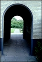 Hvert gårdrum har adgang til omgivelserne via fire smalle adgangssmøger. Bemærk det murede stik over smøgen og det galvaniserede stålprofil, der effektivt beskytter teglhjørnerne mod stød.