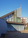Det oprindelige projekt til en ny kirkebygning, stødte på vanskeligheder da planerne for udbygning af området blev ændret. I stedet blev der udarbejdet et nyt projekt med en meget lille kirkebygning. Kirken er siden blevet udvidet, med en lille sidefløj med køkken og kapel. Der er i forlængelse af kirkerummet to små menighedslokaler, som ved en foldevæg kan slås sammen. Der er også en foldevæg ind til kirkerummet, således at dette også kan udvides. Kirken kendetegnes ved det triangulære gavlmotiv og de patinerede lette facader med beklædning i kobber, malet metal og træ.