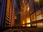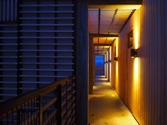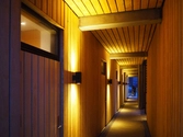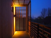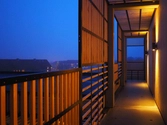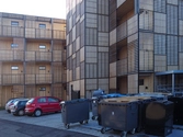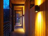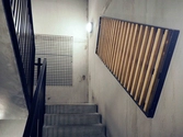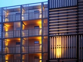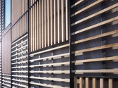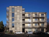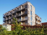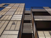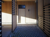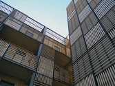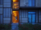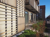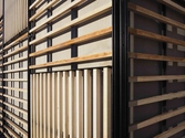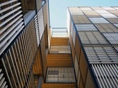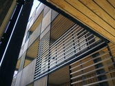 Volumenet er pakket ind i en facadebeklædning af accoya-trælameller. Rammerne med trælameller danner også rækværk og solafskærmning. Mellem de to bygningskroppe, ligger et trappetårn med elevator, som forbinder til lejlighederne via to svalegange.