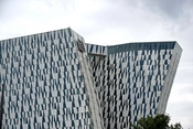 Facadeelementerne er delt op i et mønster af trekanter, der følger hældningen, og ligner en gentagelse fra et andet af tegnestuens byggerier: Saxo Bank