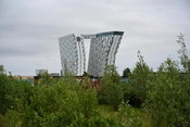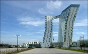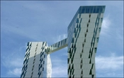 De to bygninger læner sig hver 15 grader væk fra hinanden og bliver således til et landemærke for Bella Centeret.