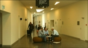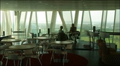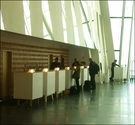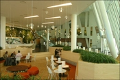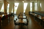 Lobbycafeen er udforment som et rum i rummet. På dets paneler er anvendt asketræ.