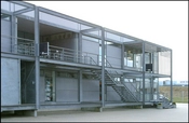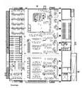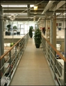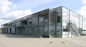 Et indskudt dæk spænder igennem hele bygningens længde. På første sal er administration, mødelokaler og kantine placeret.