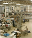 Produktionshallen præges af hvidmalede stålbjælker, der spænder over hele rummet.