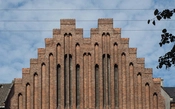 Kirkens indgangsfacade er udført i rød teglsten med udpræget sengotiske detaljer.