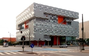 Det gråstribede, syv etagers hus er hævet en etage over terræn og skaber herved en åben plads på det stærkt trafikerede hjørne, som danner indgang til Universitetskvarteret i Ørestad Nord.