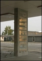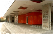 Manende engelske ord er opsat på bygningens bærende søjler, her: Tålmodighed! Udsmykningen er udført af kunstneren Viera Collaro.