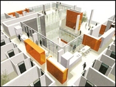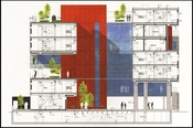 Igennem stueetagens dybe indskæringer ses husets orangefarvede kerne, hvor trapper, elevatorer og tekniske installationer er samlet.