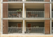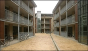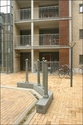De brede altangange/terrasser er møbleret med borde og bænke, som beboerne kan flytte ud i torverummet efter behov.