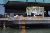 Biocenteret er en bygningstype der har sanitet (toiletter) som kerneydelse, leverer en række vigtige services til et tæt bebygget slumkvarter – og som samtidigt skaber et socialt mødested. Pavillonen består af 3 kerneelementer, der hver repræsenterer en vigtig komponent i biocenteret. For det første den sanitære installation, der er repræsenteret med et toilet omgivet af et miljø af hvide fliser. Det enkle toilet er umiddelbart genkendeligt, men med BLOX som baggrund og Københavns havn som placering, skaber det også undren og nysgerrighed.