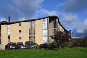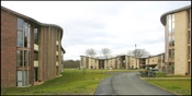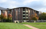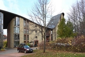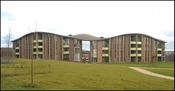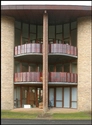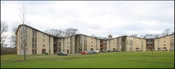 Viceværtens kontor adskiller sig markant fra den øvrige bebyggelse og er beklædt med stålplader.