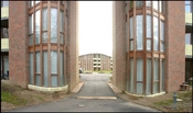 En blind vej fører ind til bebyggelsens midte og parkeringspladser.