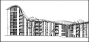 Facadeudsnit af bebyggelsens 8 etager høje afslutning mod nord.