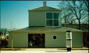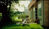 den hvide trappe og de hvide vinduessprosser refererer til tidens postmodernisme.