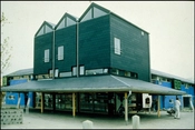 Butikken er placeret i det øverste hjørne af bebyggelsen der åbner sig mod syd omkring et fælleshus.