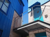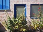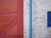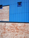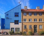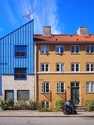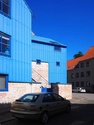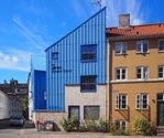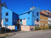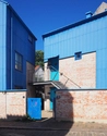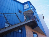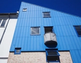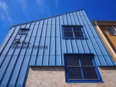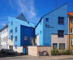 Anvendelsen af billige stålplader på facade og tag samt den blå farve kendetegner flere af tegnestuen Vandkunstens projekter og smelter fint ind i det komplekse gadebillede med de mange farverige facader fra forskellige epoker. De industrielle materialer og den klare farve danner kontrast til de kringlede rum omkring de to bygningskroppe.