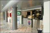Bygningens bagside mod baneterrænnet. På det øverste niveau er indrettet morgencafe med en flot udsigt over byen.