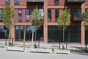 Indgangspartier og opholdsmulighederne er udført som svar på lokalplanens krav om interaktionsmuligheder indenfor 6-10 meters afstand fordelt henover facaden. Bænke er monteret på bygningens sokkel, og udført i trælameller for at give et venligt og taktilt udtryk. Den indskudte første sal er særligt markeret som en del af lokalplanens krav om et dobbelthøjt basemotiv, med et markant skift i facaderytme og vinduesstørrelser.