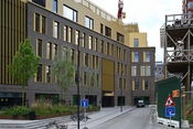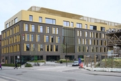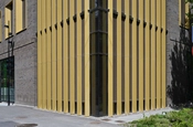 Over stueetagen er bygningskroppen mere massiv. Facaderne er murede og dansende vinduer skaber spænding mellem en let og legende effekt af forskellige funktionelle facadeåbninger i den tunge bygningskrop. Murstenene spiller i gråbrune nuancer, og refererer til den gamle bryggerigård i Carlsberg Byen.