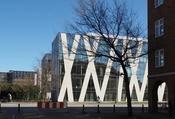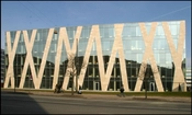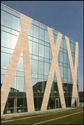 De ekspressive facader spiller på kontrasten mellem rudernes glas og travertinbeklædningen og kontrasten mellem rudernes regelmæssighed og beklædnings skrå felter.