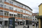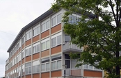 Facaden er domineret af vinduesbånd med underliggende orange brystninger.