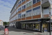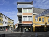 Hjørnebygning ud til Dania og Ringstedgade med lejligheder, erhverv, tagterrase og butikker i stueetagen.