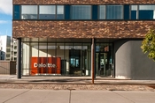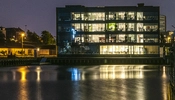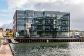 "Deloittes kontordomicil er centralt beliggende på Odense Havn, hvor områdets industrielle karakter afrundes af nærheden til den historiske bykerne og den fantastiske udsigt til skoven overfor. Byggeriet fremstår med sin præcise form og den store glasfacade ud mod havnebassinet som et moderne, åbent kontorhus, der kontrasterer havnens hårde materialer og stemning og tilbyder en 1. klasses panoramaudsigt ud over havnerummet fra samtlige etager.Bygningens indre kendetegnes af sin åbne og generøse rumfordeling, der giver alle kontorer lige adgang til lys og udsigt. Det store, nordvendte, åbne vue mod havneløbet giver, sammen med husets åbne planer, mulighed for, at lyset kan strømme ind overalt i det fire etager høje atrium.