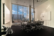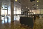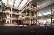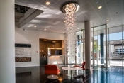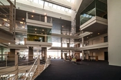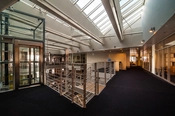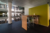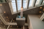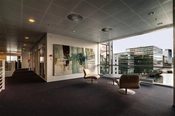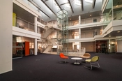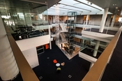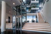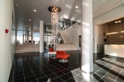 Med den spatiøse trappe trækkes man ind i fordelingsområdet, hvor udkragede møderum, store reposer og hyggelige mødepladser lokker til samtale og kommunikation i det attraktive fællesrum for virksomhedens medarbejdere." citat Henning Larsen - arkitekt
