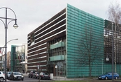 Overgangen mellem den fælles kobberfacade og den danske ambasades stålfacade er udformet som et glasparti i fuld bygningshøjde.