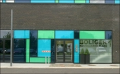 Den lave bygning er holdt i neutrale farver: hvidt og sort.